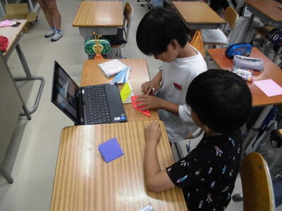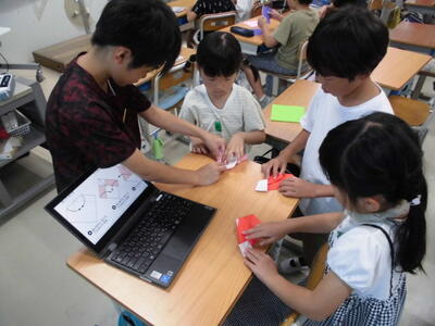 高学年の子どもたちが、同じ班の下学年のメンバーにおり紙のおり方を教え、楽しく活動することができました。