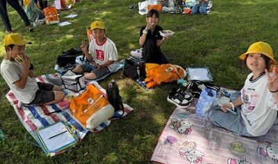 昼食の時間は、青空の下、どの子も嬉しそうにお弁当をほおばっていました。